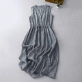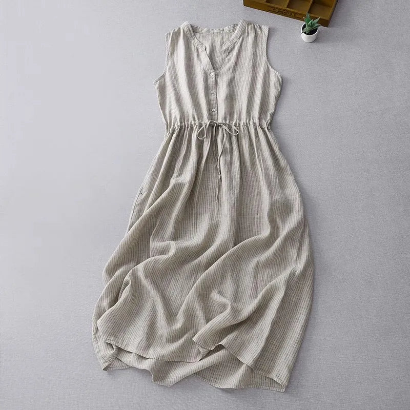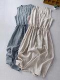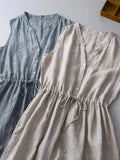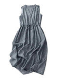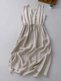 Cotton Sleeveless Dresses for Women 2025 New Summer Elegant Drawstring Tank Dress Casual Loose Vintage Stripe Female Midi Dress